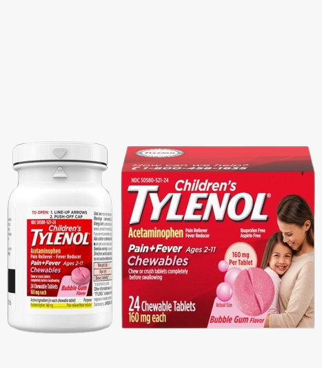 Each chewable tablet contains 160 milligrams of the pain reliever and fever reducer acetaminophen to temporarily reduce fever and help relieve minor aches and pains due to the common cold, flu, sore throat, headache, and toothache. This children’s cold & flu symptom medicine also comes in a kid-friendly grape flavor and is both ibuprofen-free and aspirin-free, and is gentle on the tummy. Tylenol is the #1 pediatrician recommended brand for pain & fever relief. Tylenol has been relied on by parents for over 60 years.